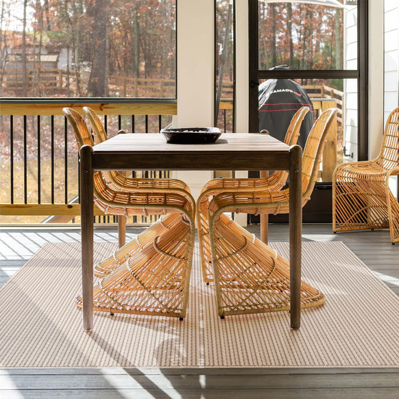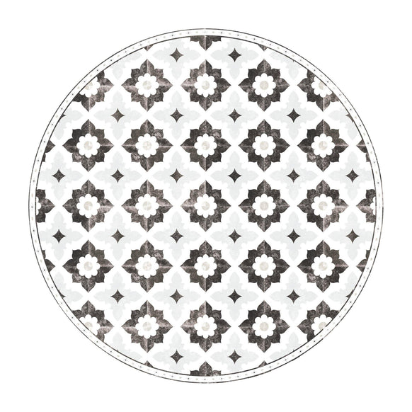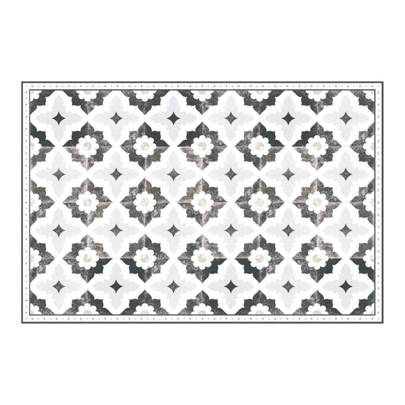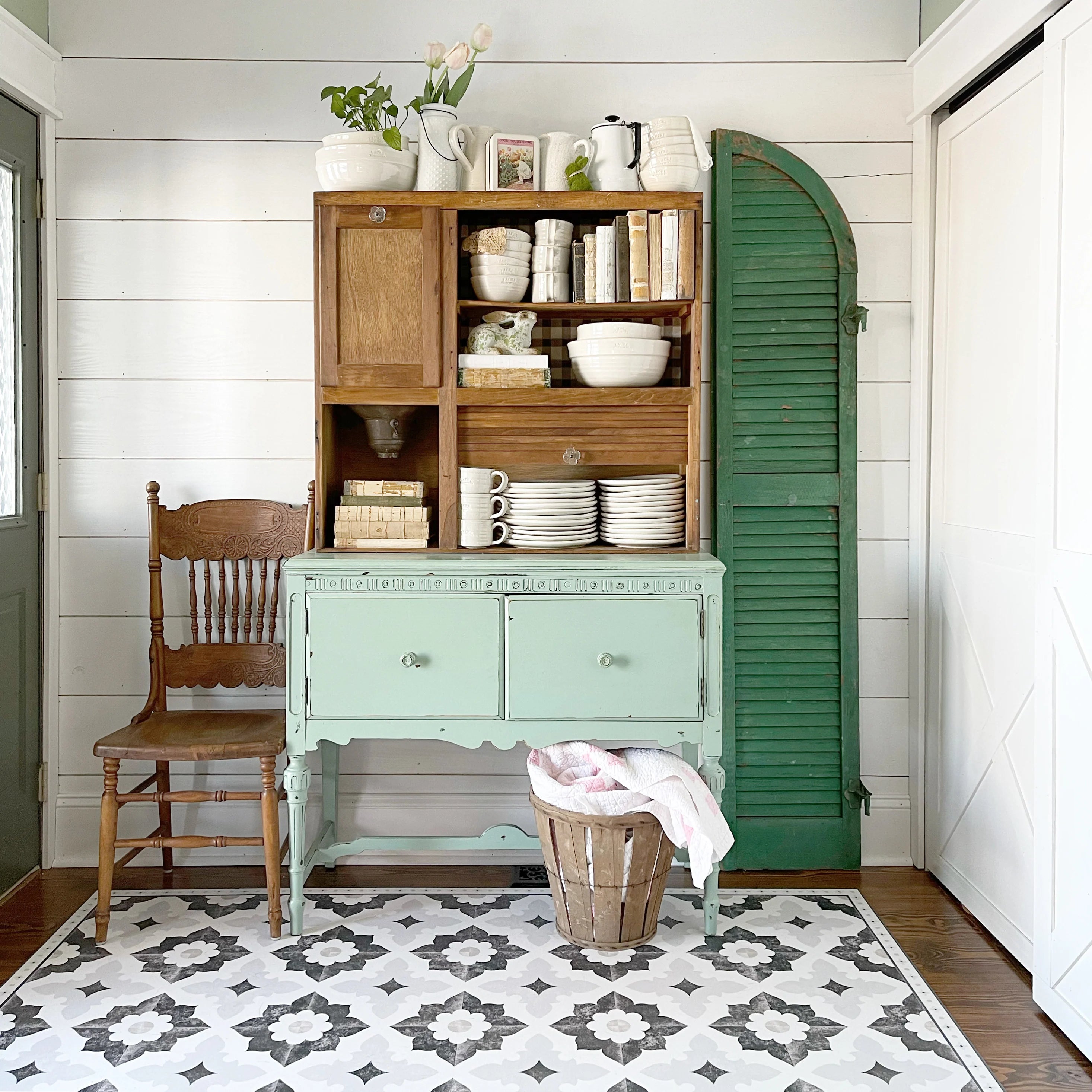 "Typically my focal point in a space is a thrifted piece of furniture. I tend to lean towards shades of green with wood and white accents. The perfect floor covering helps bring the space together, almost like a wall covering can. It’s fun to go a little more bold with this choice because it can easily be changed out. My 1st FloorFlat was the Sarah in black and gray. I put it in a space that didn’t have a lot of those colors and it did wonders for that space."